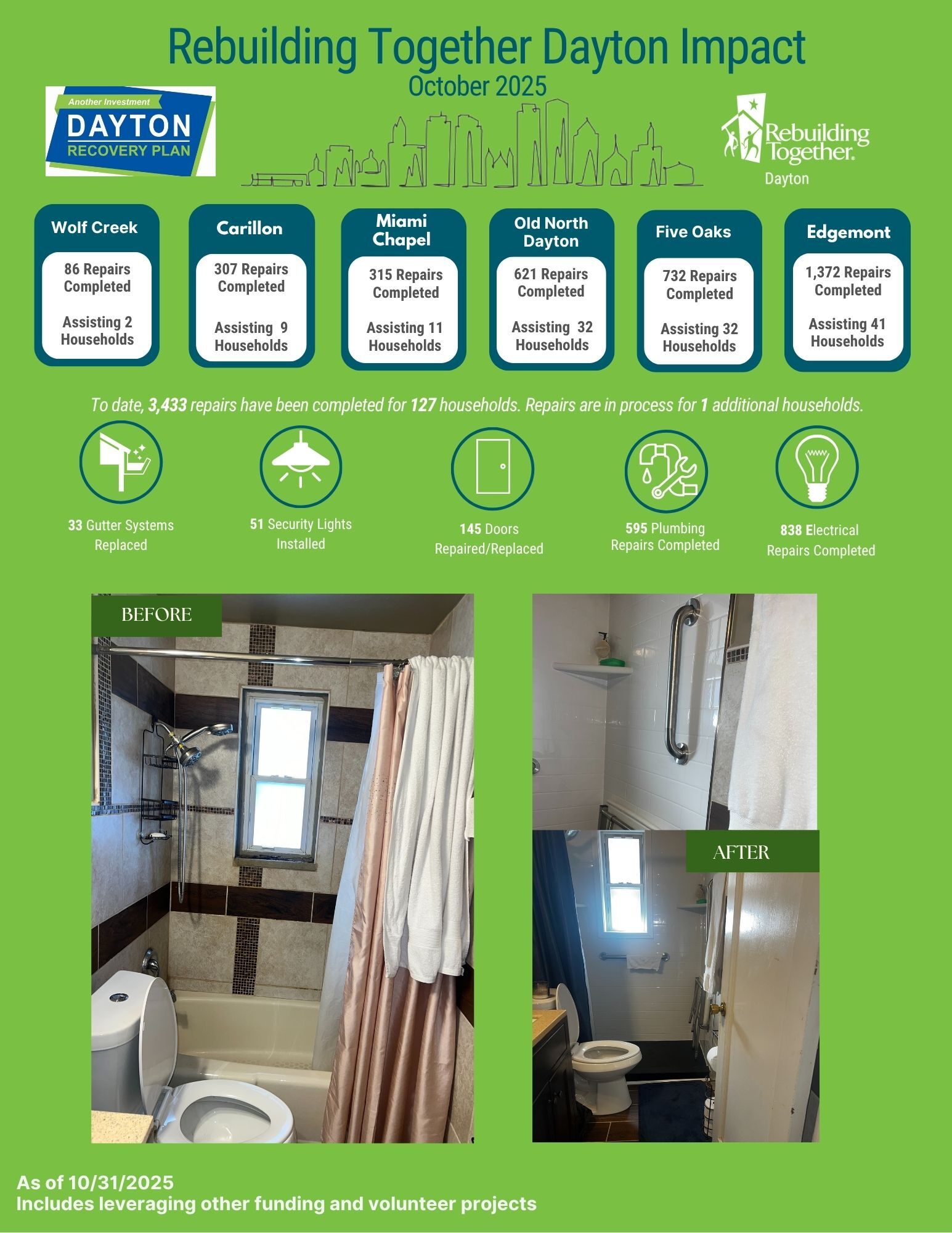 On March 11, President Joe Biden signed the American Rescue Plan Act (ARPA), with the goal of speeding recovery from the economic and health effects of the coronavirus pandemic. As part of the plan, the City of Dayton will receive nearly $138 Million in two equal distributions. This one-time money will be used to provide for immediate recovery needs and to create long-term investments for Dayton’s future. Rebuilding Together Dayton was awarded $1.8 Million of this funding to assist with home repairs and modifications in the priority target neighborhoods. The funding will be utilized in the targeted areas over the next three years.