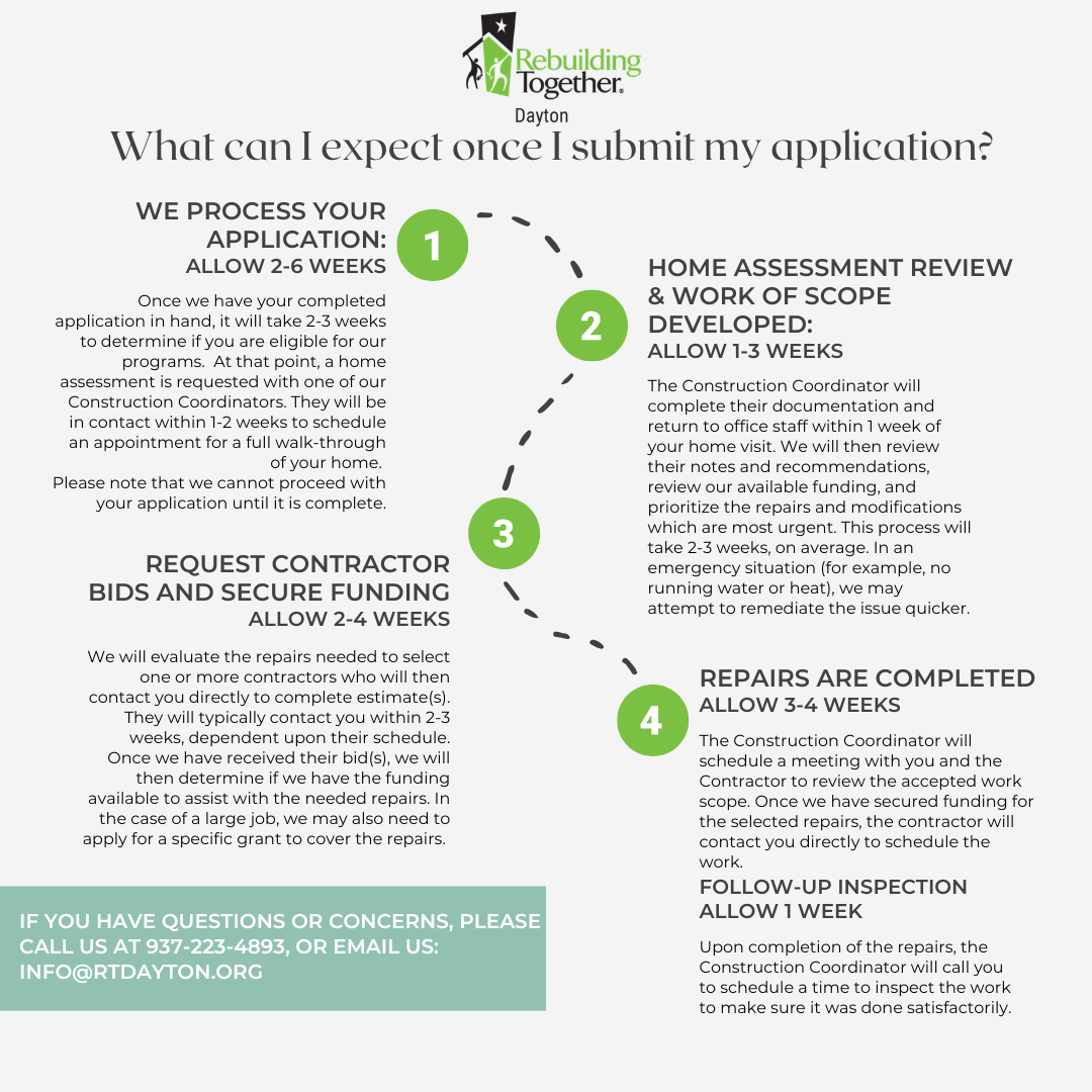 To provide support to as many eligible households as possible, Rebuilding Together Dayton limits certain types of direct assistance to once every two calendar years per household or individual applicant.
